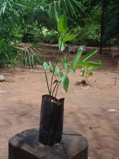 A muda está plantada em terra e possui raízes, rizoma, ainda que em formação, haste ou colmo, em alguns casos 02 unidades ou broto sendo emitido, folhas, e galhos (na maioria dos casos).
